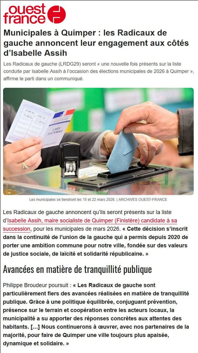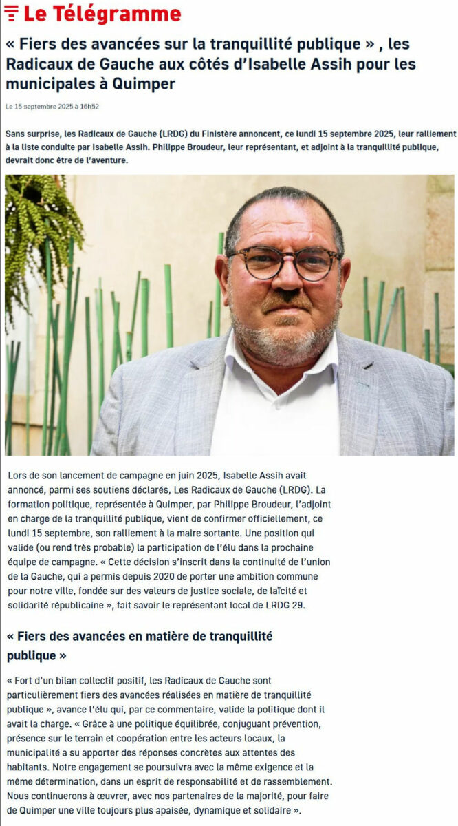 Les Radicaux de Gauche de Quimper seront une nouvelle fois présents sur la liste conduite par Isabelle Assih à l’occasion des élections Municipales de 2026.